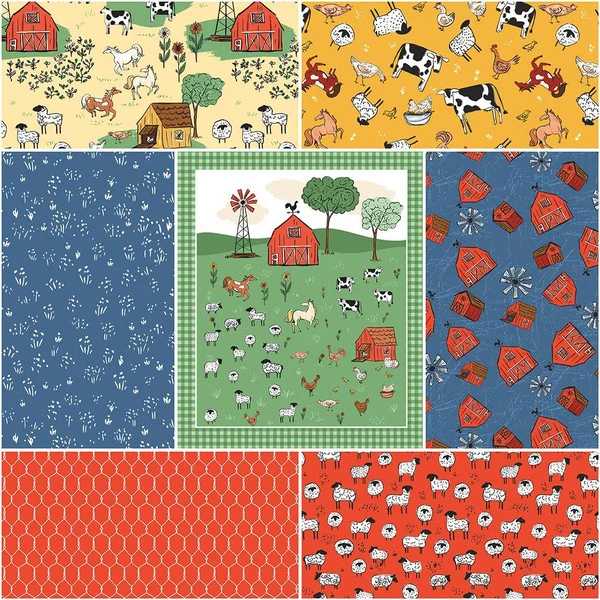 Item Description: This 1-Yard precut bundle includes a 1-yard piece of each print in the sunshine colorway (C15180-SUNSHINE, C15181-YELLOW, C15182-DENIM, C15183-DENIM, C15184-RED, C15185-RED) and P15186-PANEL from the Farm Livin’ collection by Diane Labombarbe for Riley Blake Designs for a total of 6 yards and 1 panel.