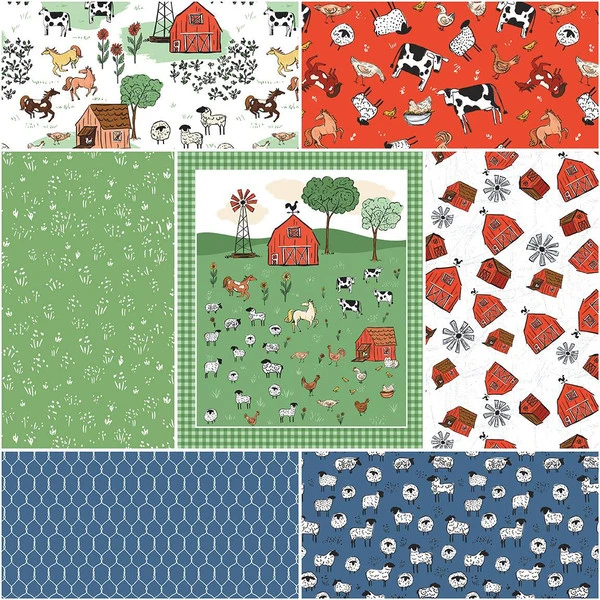 Item Description: This 1-Yard precut bundle includes a 1-yard piece of each print in the white colorway (C15180-WHITE, C15181-RED, C15182-GREEN, C15183-WHITE, C15184-DENIM, C15185-DENIM) and P15186-PANEL from the Farm Livin’ collection by Diane Labombarbe for Riley Blake Designs for a total of 6 yards and 1 panel.