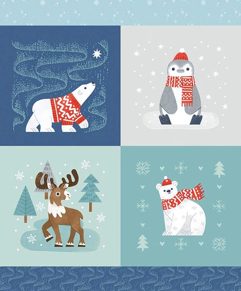 Item Description: This double napped flannel from Northern Lights by Natàlia Juan Abelló for Riley Blake Designs is great for apparel, blankets, quilts and quilt backs. This panel features a patchwork with four winter animal scenes. Panel size is 36″ x 43″.