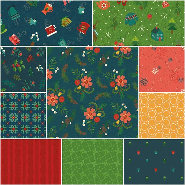 Item Description: This 1-Yard precut bundle includes a 1-yard piece of each print in the navy colorway (C14860-NAVY, C14861-NAVY, C14862-GREEN, C14863-NAVY, C14864-NAVY, C14865-CORAL, C14866-GOLD, C14867-RED, C14868-GREEN, C14869-NAVY) from the In From the Cold collection by Heather Peterson for Riley Blake Designs for a total of 10 yards.