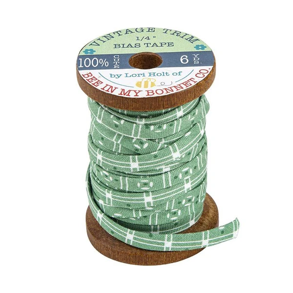 Item Description: 1/4″ Double Fold Bias Tape by Lori Holt of Bee in my Bonnet will add just the right touch of vintage to your projects. This double-fold bias trim allows for easy and convenient quilt binding, but is also fun on bibs, clothes, aprons or any raw edge. Each wooden spool holds 6 yards.