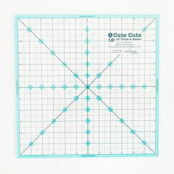 Item Description: The Trim-it™ Rulers by Lori Holt of Bee in my Bonnet are non-slip and easy to use for trimming up your blocks after piecing, applique or embroidery. Use the diagonal lines to easily center your block when trimming and and use the colored outside 1/4″ seam allowance marks to help you see what will show of your block after sewing it into your quilt. The ruler has aqua and denim markings printed in 1″ grids marked in 1/8″ and 1/4″ increments.