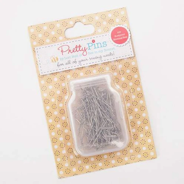 Item Description: This package of Rustproof Blocking Pretty Pins™ by Lori Holt of Bee in my Bonnet contains 100 pins and comes in a cute little plastic mason jar container!