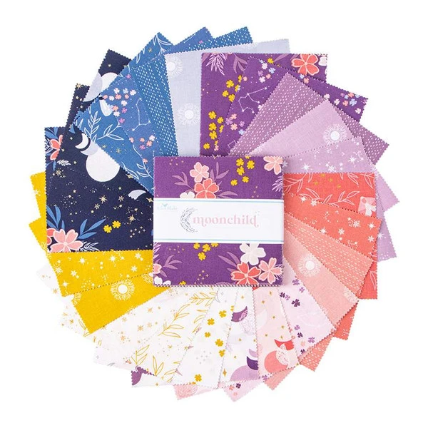 Item Description: This 5″ Stacker precut bundle includes 42 pieces from the Moonchild collection by Fran Gulick of Cotton and Joy for Riley Blake Designs. Each print will be included 1-2 times in the bundle.
