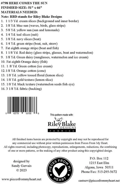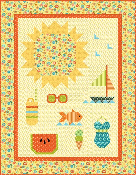 Item Description: The Here Comes the Sun Quilt by Sandy Gervais of Pieces from My Heart features pieced summer-themed blocks. Finished size is 51″ x 66″.