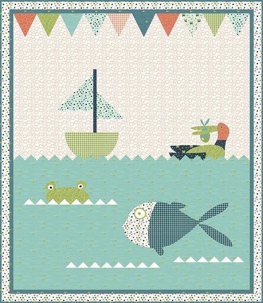 Item Description: The Lake Fun Quilt by Sandy Gervais of Pieces from My Heart is fat quarter friendly and features a boat, duck, frog and fish. Finished size is 66″ x 76″.