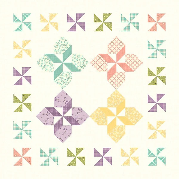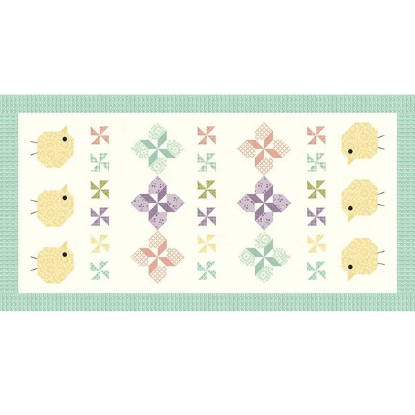 Item Description: The New Beginnings Mat and Chick Runner by Sandy Gervais of Pieces from My Heart feature pinwheels and chicks. Finished mat size is 20″ x 20″ and runner size is 24″ x 46″.