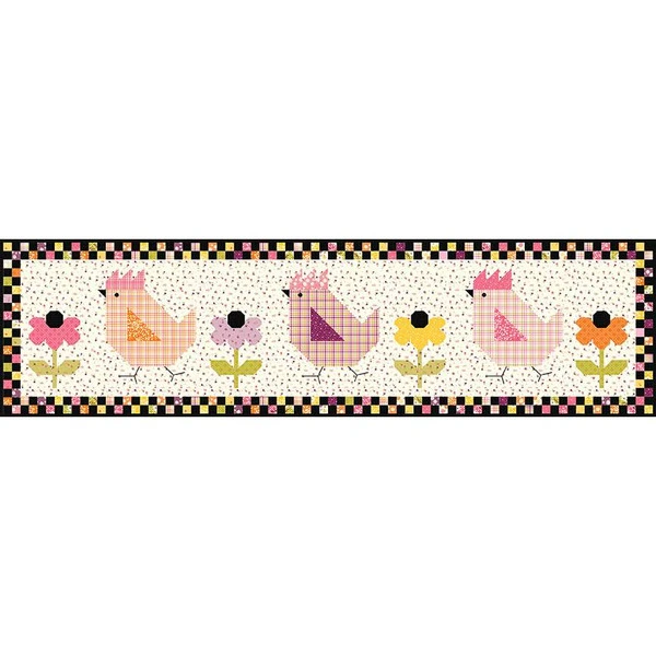 Item Description: The On the Run Runner by Sandy Gervais of Pieces from My Heart is reminiscent of the chickens her Grammie raised. Some were saved for egg laying and others were dressed and put in the freezer for winter meals. It looks like these chickens are hoping to be the ones kept for egg laying. Finished size is 20″ x 76″.