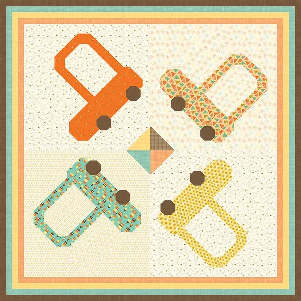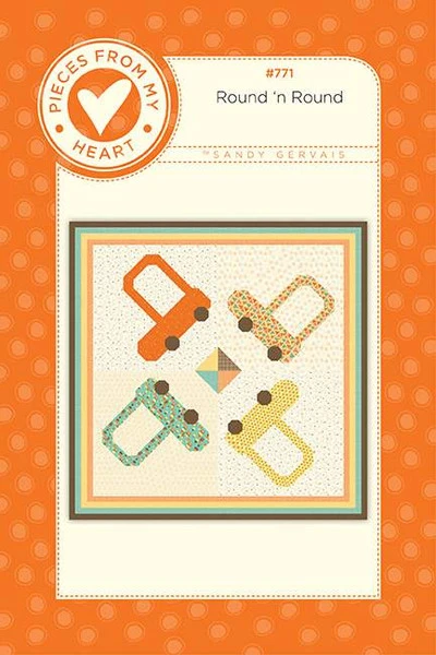 Item Description: The Round ‘n Round Quilt by Sandy Gervais of Pieces from My Heart features four pieced cars set on point circling around an hour glass block. Finished size is 50 1/2″ x 50 1/2″.