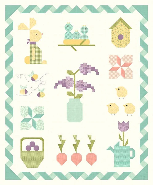 Item Description: The Spring Sampler Quilt by Sandy Gervais of Pieces from My Heart features pieced spring-themed blocks with a pieced ribbon border. Finished size is 58″ x 70″.