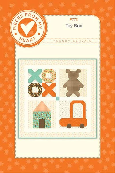 Item Description: The Toy Box Quilt by Sandy Gervais of Pieces from My Heart features four pieced blocks with sashing and a border. Finished size is 42″ x 42″.