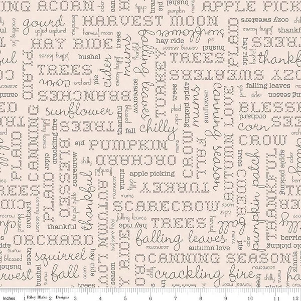 Item Description: Autumn by Lori Holt of Bee in my Bonnet for Riley Blake Designs is great for quilting, apparel and home decor. This print features fall-themed text. It’s 107″/108″ wide to accommodate most quilt backs.