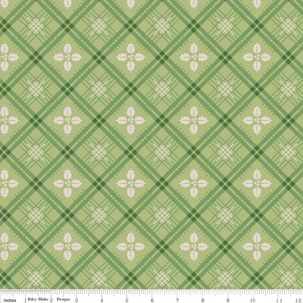 Item Description: Home Town Holiday by Lori Holt of Bee in my Bonnet for Riley Blake Designs is great for quilting, apparel and home decor. This print features a diagonal plaid design with holly leaves. It’s 107″/108″ wide to accommodate most quilt backs.