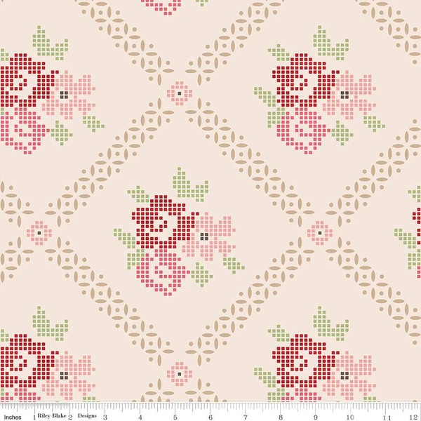 Item Description: The Mercantile collection by Lori Holt of Bee in my Bonnet for Riley Blake Designs is great for quilting, apparel and home decor. This print features a diagonal gird with cross stitched flowers. It’s 107″/108″ wide to accommodate most quilt backs.